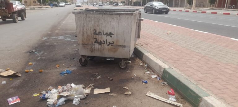 تشهد العديد من الأحياء والشوارع بجماعة برادية، إقليم الفقيه بن صالح، إنبعاث روائح كريهة من محيط حاويات الأزبال وتراكم بقايا القمامة حولها، في ظل غياب جمع منتظم للنفايات وتنظيف دوري بإستعمال المعدات والمواد الضرورية. هذا الوضع يخلف بقعا سوداء على الشوارع والأرصفة، خاصة على مستوى الشارع الرئيسي بالطريق الوطنية الرابطة بين الفقيه بن صالح وبني ملال، والذي يعد واجهة أساسية للجماعة القروية ونقطة حيوية تعج بالمحلات التجارية والمقاهي التي يرتادها مستعملو الطريق.
