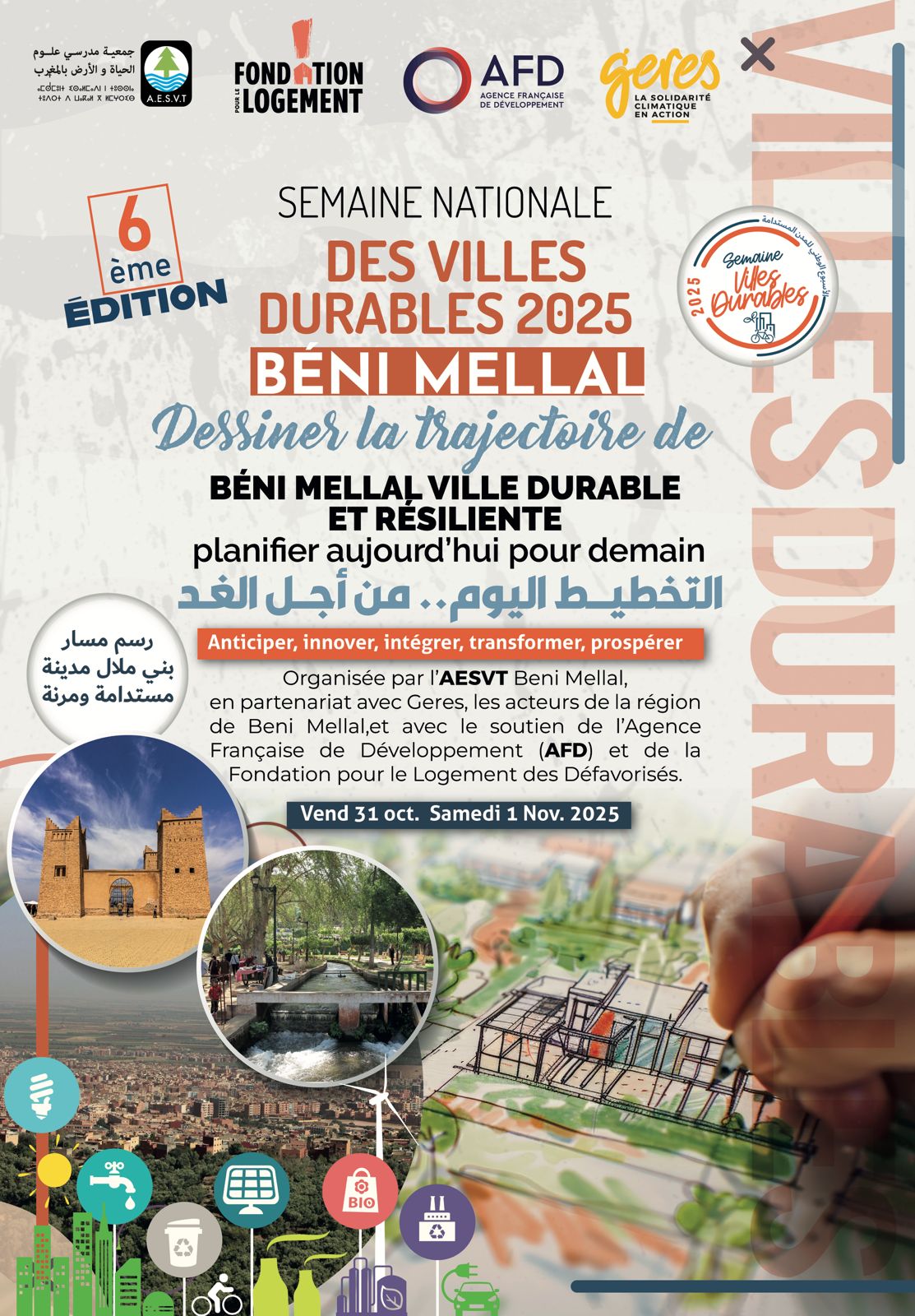 تستعد مدينة بني ملال لاحتضان النسخة السادسة من الأسبوع الوطني للمدن المستدامة، الذي تنظمه جمعية مدرسي علوم الحياة والأرض فرع بني ملال، بشراكة مع منظمة GERES وبدعم من الوكالة الفرنسية للتنمية (AFD) ومؤسسة إسكان الفئات المحرومة (FAP)، وذلك خلال الفترة الممتدة من الجمعة 31 أكتوبر إلى السبت 1 نونبر 2025.