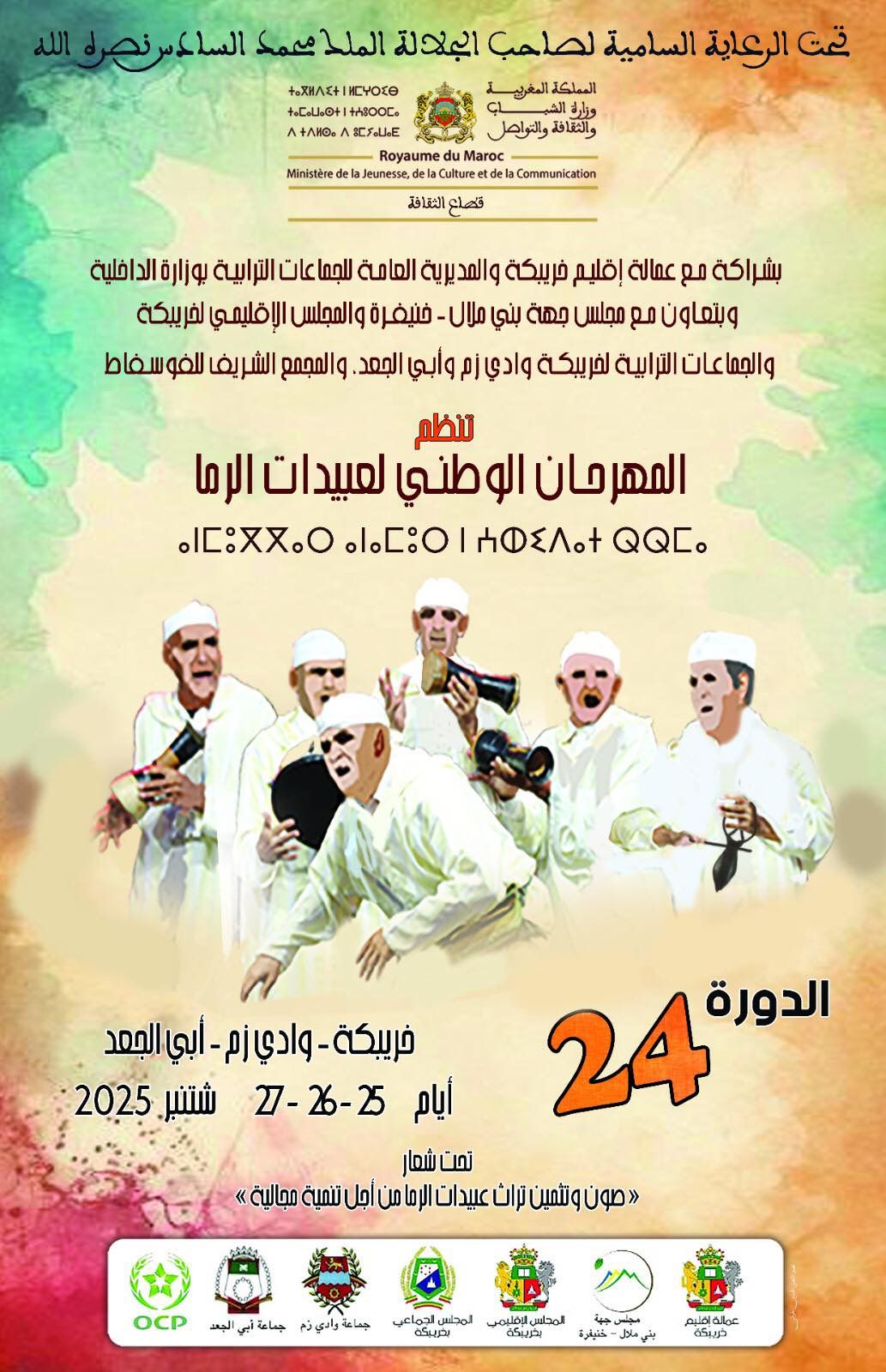 تحت الرعاية السامية لصاحب الجلالة الملك محمد السادس نصره الله وأيده، وتحت شعار:”صون وتثمين تراث عبيدات الرما من أجل تنمية مستدامة” تنظم الدورة الرابعة والعشرين(24)للمهرجان الوطني لعبيدات الرما أيام 25-26-27 شتنبر 2025 بإقليم خريبكة وروافده ومدنه “أبي الجعد، وادي زم، خريبكة، بوجنيبة، حطان، وبولنوار” بمشاركة 45 فرقة مشاركة منها 42 مجموعة تمثل لون عبيدات الرما و 3 فرق كضيوف شرف المهرجان.