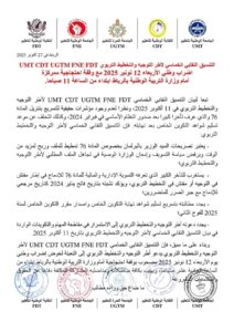 وطالب البيان كذلك بـتسريع تسليم شواهد نهاية التكوين الخاص، وإصدار مقرر التكوين للفوج الثاني لسنة 2025، داعياً في الوقت نفسه أطر التوجيه والتخطيط إلى الاستمرار في مقاطعة المهام والتكوينات وفق ما جاء في بيان 11 أكتوبر الماضي.