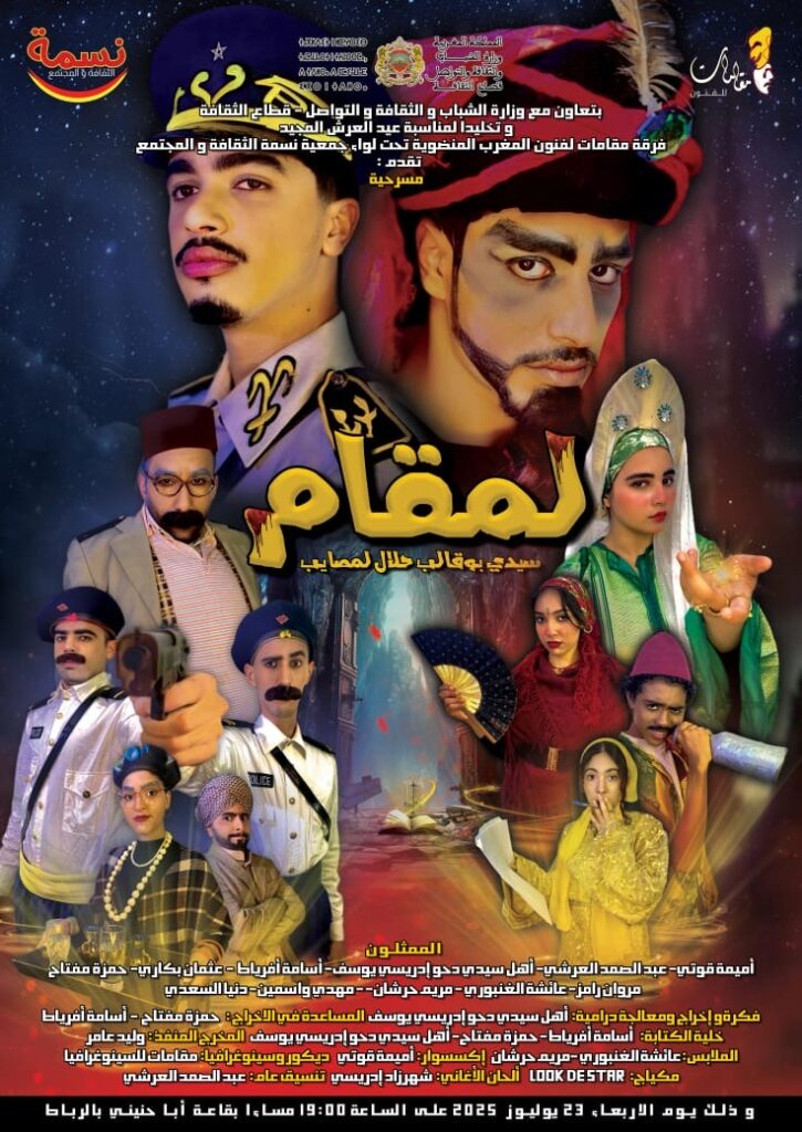 قدّمت فرقة “مقامات لفنون المغرب”، مساء الأربعاء 23 يوليوز 2025، عرضاً مسرحياً جديداً بعنوان “لمقام” احتفاءً بالذكرى السادسة والعشرين لعيد العرش المجيد، وذلك بقاعة أبا حنيني في مدينة الرباط، في إطار تعاون مع وزارة الشباب والثقافة والتواصل. وقدّم هذا العمل المسرحي بأسلوب ساخر وعميق، يجمع بين الترفيه والنقد الاجتماعي، من طرف طلبة شعبة الفن الدرامي – لغة عربية، بالمعهد البلدي بشارع باريس، تحت إشراف وتأطير الأستاذ صديق مكوار، الذي يقود هذا المشروع الفني الشبابي الطموح منذ بدايته.