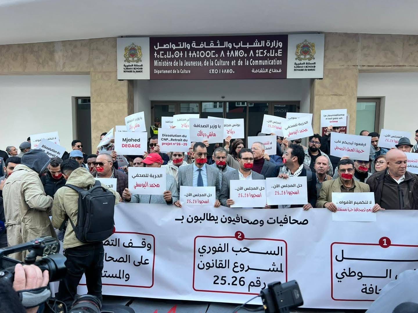 هزت العاصمة الرباط مساء يوم الجمعة الماضي 28 نونبر الجاري وقفة احتجاجية حاشدة وصامتة نفذها مئات الصحافيين والصحافيات أمام مقر وزارة الشباب والثقافة والتواصل، في مشهد وُصف بـ”التاريخي”. رفع المشاركون شعاراً موحداً يطالب بـ”الحل الفوري” للمجلس الوطني للصحافة وإسقاط ما أسموه “قانون التحكم”، وقد لبى المحتجون نداء لجنة “بيان من أجل حل المجلس الوطني للصحافة”. اختار المشاركون في هذا الشكل النضالي وضع شارات حمراء على أفواههم، كرسالة رمزية قوية تندد بسياسة “تكميم الأفواه” وتراجع منسوب الحريات الصحافية، معلنين تضامنهم المطلق مع ضحايا “التسريبات” الأخيرة. وجهت الكلمة النارية التي تليت خلال الوقفة انتقادات لاذعة لوزير القطاع، المهدي بنسعيد، واصفة إياه بـ “الوجه الأبيض الظاهر من جبل الجليد وسط بحر مهني أسود”، ومتهمة إياه بـ”التشيطين” بعد نعته للمنتقدين بـ”العدميين”. واعتبر المتحدثون أن ما كشفته تسريبات لجنة الأخلاقيات لم يكن مجرد اجتماع عادي، بل كان “مسلحاً ينزع فيه جلد الصحافي حميد المهداوي” باستعمال “الأساليب المنحطة”، كل ذلك بمباركة من “مركب المصالح” الذي يقولون إنه اختطف المهنة. كما حذر الغاضبون بشدة من خطورة مشروع القانون رقم 26.25، الذي اعتبروه “مشروع السلطة” الذي دبر “بليل” لتفصيل مجلس على مقاس “المشهرين” ولوبيات الريع، بهدف رئيسي هو تحويل الصحافة إلى مجرد أداة لإلهاء المغاربة عن قضايا الفساد والمال العام. وقد رفعت الوقفة لائحة مطالب مستعجلة، تصدرها “السحب الفوري” لمشروع القانون المثير للجدل، وفتح تحقيق مستقل وشفاف في انتهاكات لجنة الأخلاقيات، ووقف سياسة التعيين والتحكم، وإعادة بناء منظومة الدعم العمومي على أسس تضمن الشفافية والنزاهة. وفي ختام شكلهم النضالي، أكد المحتجون أن معركتهم مستمرة ولن تتوقف حتى استعادة الصحافة لدورها الطبيعي كـ “خادمة للمصلحة العامة”، ولقطع الطريق أمام كل من يسعى لتحويلها إلى بوق للدعاية وتصفية الحسابات الشخصية والسياسية.