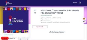 أعلنت بوابة الفيفا الرسمية لبيع تذاكر مونديال الشباب بالتشيلي، نفاذ تذاكر المباراة النهائية التي ستجمع بين المنتخبين المغربي والأرجنتيني الأحد المقبل 19 أكتوبر على الملعب الوطني بالعاصمة سانتياغو والذي يتسع لأزيد من 48.000 متفرج.