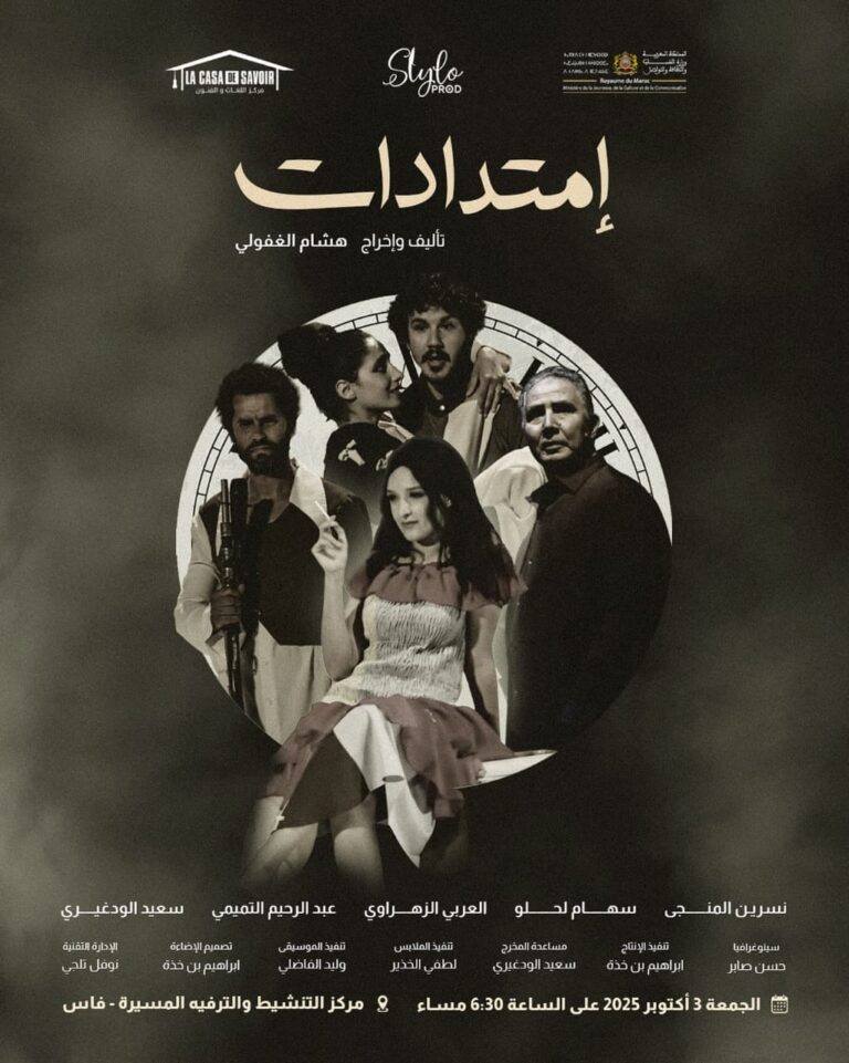 يواصل المخرج هشام الغفولي تقديم مسرحيته “إمتدادات” على مسرح مركز التنشيط والترفيه المسيرة بفاس، حيث من المقرر أن تُعرض مجدداً يوم الجمعة 3 أكتوبر 2025 على الساعة 18:30.