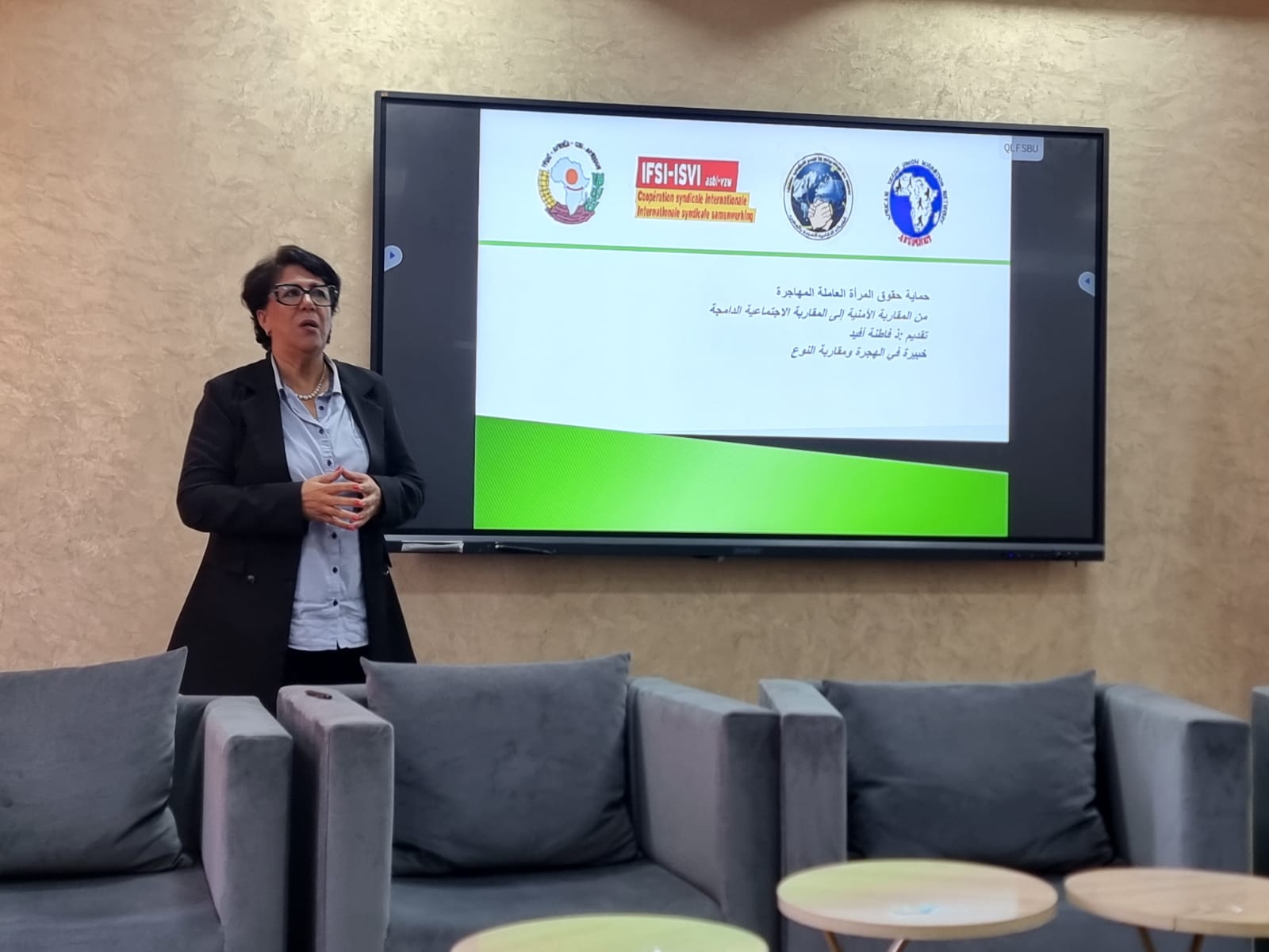 العرض الأول تحت عنوان: حماية حقوق النساء المهاجرات-مقاربة اجتماعية للظاهرة-من تقديم الأستاذة فاطنة أفيد،أما العرض الثاني فقد واصلت من خلاله الأستاذة و المحامية نعيمة كلاف تسليط الضوء على المقاربة السياسية كمدخل لفهم و معالجة هذه الظاهرة.