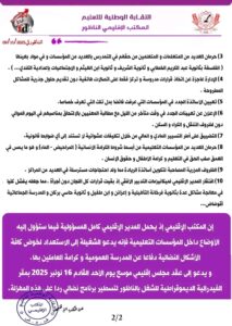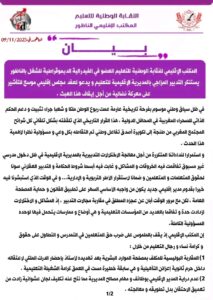 وختم المكتب الإقليمي للنقابة الوطنية للتعليم بالناظور بيانه بالتأكيد على أن الشغيلة التعليمية مدعوة إلى التعبئة الجماعية لخوض معارك نضالية حازمة، دفاعًا عن المدرسة العمومية وحقوق العاملين بها، محمّلًا المدير الإقليمي “المسؤولية الكاملة في ما ستؤول إليه الأوضاع داخل القطاع بالإقليم”.