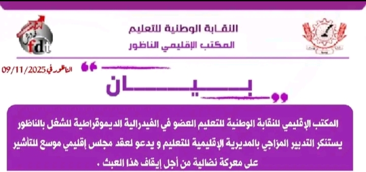 في خطوة تصعيدية جديدة، عبّر المكتب الإقليمي للنقابة الوطنية للتعليم، العضو في الفيدرالية الديمقراطية للشغل بالناظور، عن استنكاره الشديد لما وصفه بالتدبير المزاجي والعبثي داخل المديرية الإقليمية للتعليم، معلنًا عزمه الدعوة إلى عقد مجلس إقليمي موسع يوم الأحد 16 نونبر الجاري، من أجل التأشير على برنامج نضالي تصعيدي دفاعًا عن المدرسة العمومية وكرامة الأطر التربوية والإدارية.