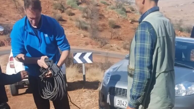 وحسب إفادات شهود عيان، فقد لاحظ السائح السيارة وهي تفقد توازنها على حافة الطريق، فسارع إلى استعمال حبال كان يحملها داخل مركبته لربط السيارة العالقة بسيارته الخاصة، فيما تولت زوجته مساعدته في عملية التثبيت.