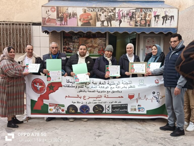 شهدت حملة التبرع بالدم التي نظمتها اللجنة الوطنية المغربية لرياضة ابينكا، يوم الأربعاء 7 يناير 2026، حضوراً مدنياً بارزاً وإقبالاً واسعاً من طرف ساكنة المدينة، في مبادرة إنسانية نبيلة تحت شعار “قطرة من دمك تساوي حياة” ”