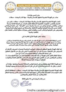 أصدرت الهيئة المغربية لحقوق الإنسان والبيئة بجهة الدار البيضاء – سطات بيانًا رسميًا، أعربت فيه عن تقديرها واعتزازها بالتطورات القانونية المرتبطة بالقرار الصادر عن النيابة العامة بمدينة مراكش، والقاضي بإيداع مواطن جزائري سجن “الأوداية” على خلفية أفعاله التي تمس بالسيادة الوطنية والقيم الأخلاقية، والتي تضمنت تمزيق أوراق نقدية وطنية، والتحريض على الكراهية، والسب والقذف العلني بعبارات منافية للآداب العامة خلال تظاهرة رياضية.