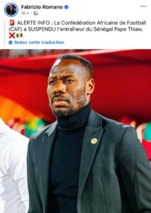 وبحسب ما أورده الصحفي الإيطالي المتخصص في أخبار كرة القدم، فابريزيو رومانو، فإن الهيئة الكروية الإفريقية أصدرت قرار الإيقاف بشكل رسمي، في انتظار بلاغ توضيحي يحدد حيثياته ومدته، وهو ما فتح باب التأويلات بشأن مستقبل المدرب السنغالي مع منتخب بلاده.