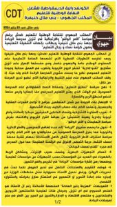 وفي ختام بيانها، طالبت النقابة بصرف كافة المستحقات المالية العالقة، وفتح تحقيق وطني شفاف في إختلالات التقويم وتسريبات الفروض مع ربط المسؤولية بالمحاسبة، مؤكدة أن كرامة الأستاذ “خط أحمر”، وداعية الشغيلة التعليمية إلى رص الصفوف والإستعداد لخوض مختلف الأشكال النضالية دفاعا عن المدرسة العمومية وكرامة نساء ورجال التعليم.