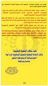 وعلى المستوى المادي، نددت النقابة بالتأخر المتكرر في صرف التعويضات، وبما وصفته بـ”الهزالة والتمييز غير المبرر” في تعويضات الريادة بين مختلف الفئات التعليمية.