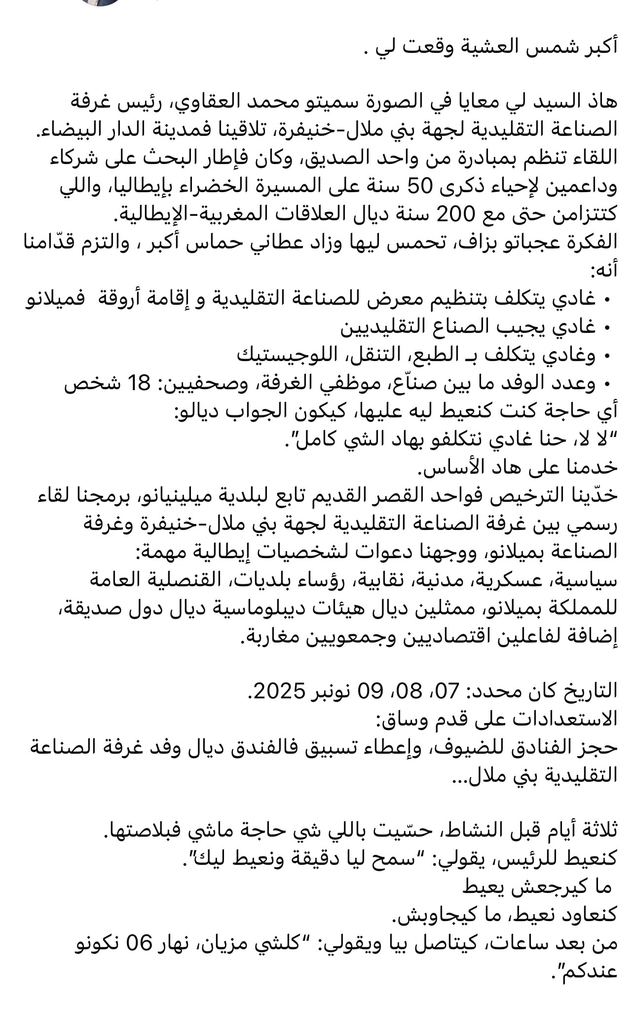 وبحسب ما ورد في التدوينة، فإن رئيس غرفة الصناعة التقليدية لجهة بني ملال–خنيفرة كان قد التزم بالمشاركة في التظاهرة عبر تنظيم معرض للصناعة التقليدية، وجلب وفد يضم صناّع تقليديين وأطر الغرفة وصحفيين، إلى جانب تحمل تكاليف اللوجستيك والتنقل والطبع. غير أن هذه الالتزامات، حسب المصدر ذاته، لم يتم الوفاء بها قبل أيام قليلة من موعد النشاط، دون توضيحات رسمية مسبقة.