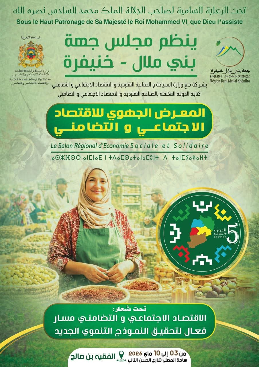 أعلن مجلس جهة بني ملال–خنيفرة عن فتح باب الترشيح أمام الهيئات الفاعلة في مجال الاقتصاد الاجتماعي والتضامني للمشاركة في الدورة الخامسة من المعرض الجهوي للاقتصاد الاجتماعي والتضامني، المزمع تنظيمه بمدينة الفقيه بن صالح خلال الفترة الممتدة من 03 إلى 10 ماي 2026، تحت الرعاية السامية لصاحب الجلالة الملك محمد السادس نصره الله.