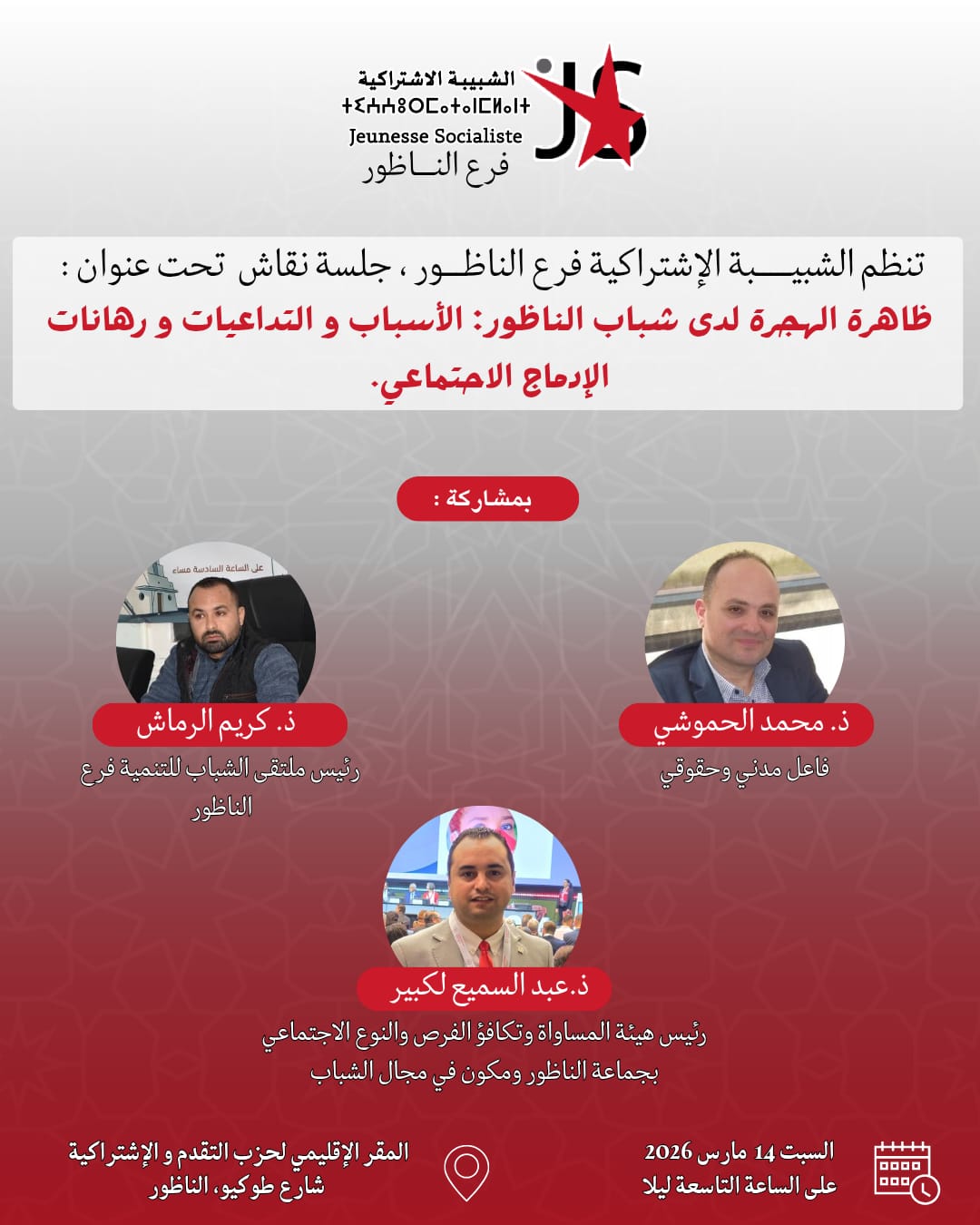 تنظم الشبيبة الاشتراكية بالناظور، مساء اليوم السبت 14 مارس 2026، جلسة نقاشية تحت عنوان “ظاهرة الهجرة لدى شباب الناظور: الأسباب والتداعيات ورهانات الإدماج الاجتماعي”، وذلك بالمقر الإقليمي لحزب التقدم والاشتراكية بالناظور، ابتداء من الساعة التاسعة ليلا.