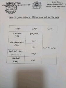 أعلنت المندوبية الجهوية لوزارة الأوقاف والشؤون الإسلامية بجهة بني ملال خنيفرة عن توقيت إقامة صلاة عيد الفطر المبارك لسنة 1447 هـ بمختلف أقاليم الجهة.