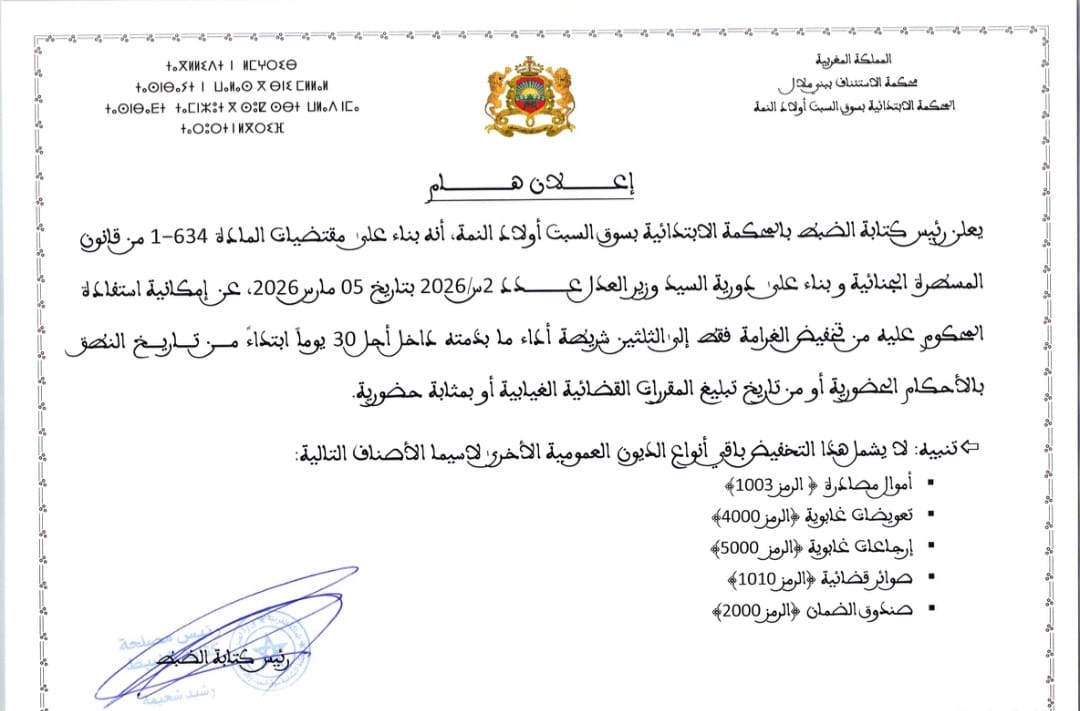 أعلنت كتابة الضبط بـالمحكمة الابتدائية بسوق السبت أولاد النمة عن إجراء جديد يهم المحكوم عليهم بالغرامات المالية، يقضي بتمكينهم من مهلة زمنية محددة لتسوية وضعيتهم دون اللجوء إلى الإكراه البدني.