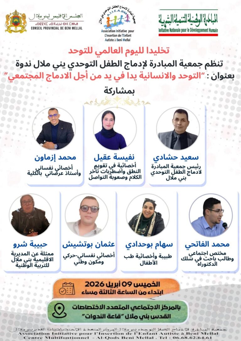 تخليداً لفعاليات اليوم العالمي للتوحد لسنة 2026، تنظم جمعية المبادرة لإدماج الطفل التوحدي ببني ملال برنامجاً تحسيسياً وتواصلياً لفائدة العموم، تحت شعار: “التوحد والإنسانية… لكل حياة قيمة”، وذلك بمركز القدس الاجتماعي متعدد الاختصاصات بمدينة بني ملال، خلال الفترة الممتدة من 7 إلى 9 أبريل الجاري.