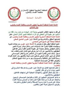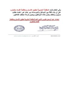 البيان، الذي جاء بتاريخ 12 أبريل 2026، أكد تضامن المنظمة المطلق واللامشروط مع الأستاذ عزيز عبري، المنسق المحلي للمنظمة بعمالة عين السبع الحي المحمدي، على خلفية ما يتعرض له من حملات تشهير ومهاجمات لفظية، اعتبرتها المنظمة مساسًا مباشرًا بحرية التعبير والعمل الحقوقي.