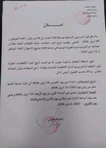 وفي هذا السياق، ستنطلق فترة إيداع الترشيحات ابتداءً من يوم الخميس 16 أبريل 2026، على أن تستمر إلى غاية زوال يوم الثلاثاء 21 أبريل 2026. كما ستُجرى الحملة الانتخابية ابتداءً من يوم الأربعاء 22 أبريل 2026، لتنتهي في منتصف الليل من يوم الاثنين 4 ماي 2026.