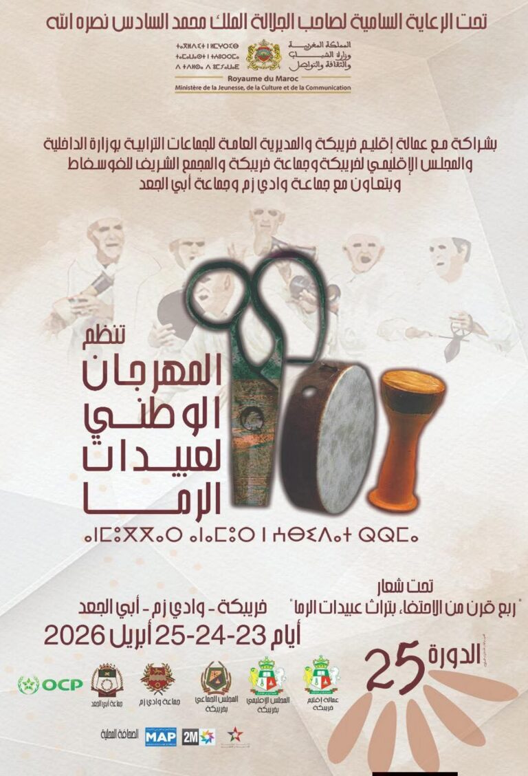 تستعد مدينة خريبكة لاحتضان فعاليات الدورة الخامسة والعشرين للمهرجان الوطني لفن عبيدات الرما، وذلك خلال الفترة الممتدة من 23 إلى 25 أبريل 2026، تحت شعار “ربع قرن من الاحتفاء بتراث عبيدات الرما”، في تظاهرة ثقافية تُنظم تحت الرعاية السامية لصاحب الجلالة الملك محمد السادس.