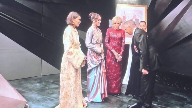 وقبل التحاقهن بالمنصة الملكية من أجل متابعة العرض، تقدم للسلام على صاحبات السمو الملكي الأميرات للا خديجة، وللا مريم، وللا حسناء، رئيسة مؤسسة المسرح الملكي الرباط، إلى جانب السيدة بريجيت ماكرون، أعضاء مجلس إدارة المؤسسة.