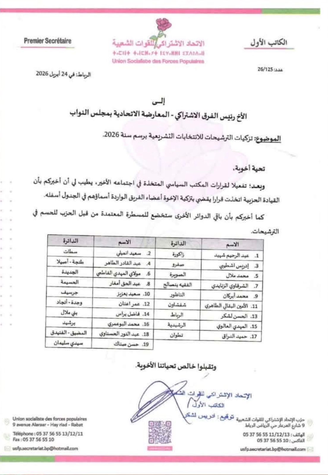 وحسب المراسلة، الموجهة إلى رئيس الفريق الاشتراكي–المعارضة الاتحادية بمجلس النواب، فقد تم الحسم في لائحة أولية من المرشحين الذين سيخوضون غمار الانتخابات في عدد من الدوائر الانتخابية، بناءً على مداولات تنظيمية ة داخلية وتقييمات سياسية وتنظيمية.